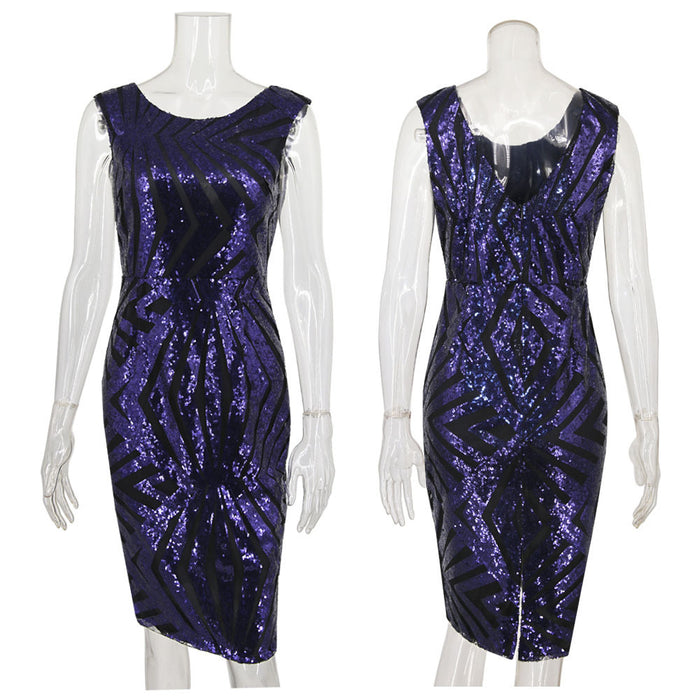 It sounds like you're describing a sleeveless sequin dress with a round neck and a slim fit, which is a great choice for a fancy event where you want to look modern and fashionable. The sequin decoration adds a touch of glamour and sparkle to the dress, making you stand out in the crowd. The mid-length style is perfect for a formal occasion, giving you a chic and elegant look. When styling this dress, you can pair it with statement earrings and high heels to complete the look. Remember, confidence is key when wearing any outfit, so wear it with pride and feel beautiful in your own skin.