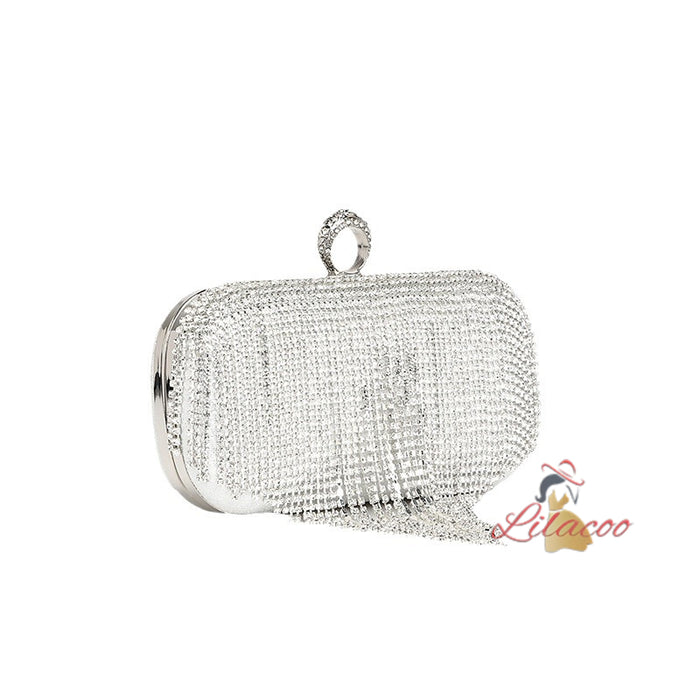 Perfect for adding a touch of glamour to any outfit, this silver handbag is a dazzling accessory that will make you stand out at any event. The exterior is covered in shimmering rhinestones that catch the light beautifully, creating a stunning sparkle effect. The intricate fringe detail adds an extra layer of elegance and movement, making this bag perfect for special occasions. Despite its compact size, this handbag offers ample space to carry your essentials, including your phone, makeup, and small wallet. The round clasp closure is both secure and stylish, adorned with additional rhinestones to complement the overall design. The detachable chain strap allows for versatile carrying options, whether you prefer to wear it over your shoulder or as a clutch. This handbag is the epitome of sophistication and style, making it a must-have addition to your collection. Its timeless design ensures it will be a cherished accessory for years to come.