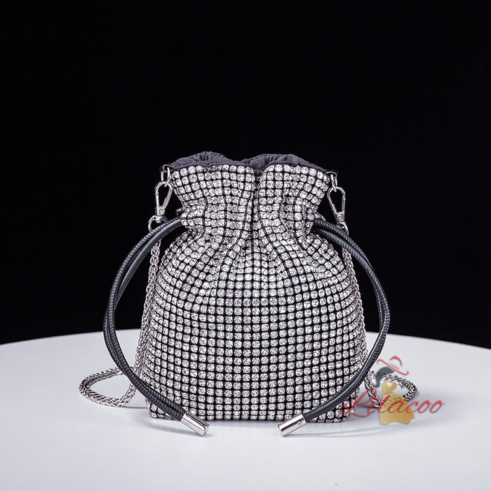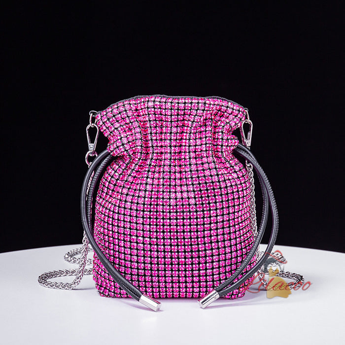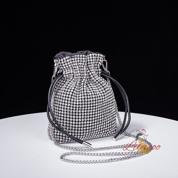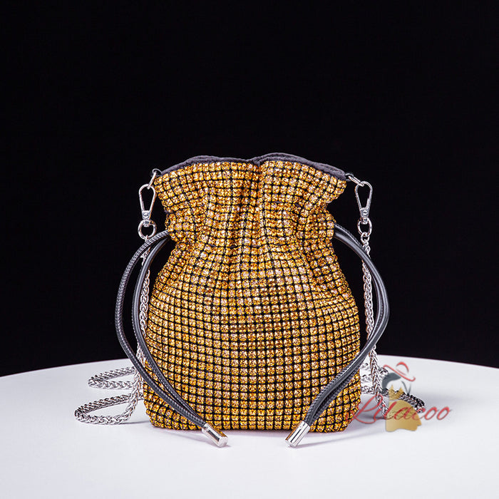 Overwhelmingly beautiful and undeniably stylish, this handbag is the epitome of luxury. Covered in glittering gold-tone crystals, it exudes a sense of elegance and sophistication that is sure to turn heads. The unique drawstring closure is both secure and stylish, ensuring that your belongings are kept safe while adding a contemporary edge to the design. The circular handle is not only a chic feature but also comfortable to carry, making this bag a versatile accessory for any occasion. The shimmering crystals catch the light from every angle, creating a stunning visual effect that complements any outfit. Inside, the bag offers enough space to carry all your essentials, making it as practical as it is beautiful. The detachable chain strap provides additional versatility, allowing you to wear it as a crossbody for hands-free convenience. Make this handbag your statement piece and enjoy the compliments that come your way.