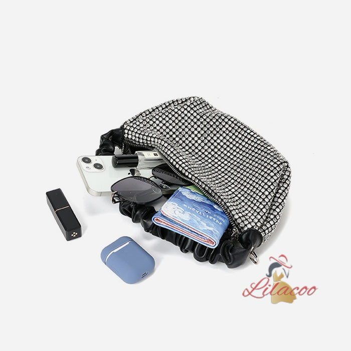 Observe the exquisite charm of this stunning handbag, an essential addition to any fashion-forward wardrobe. Adorned with a sleek black exterior, it sparkles with meticulously arranged rhinestones, making it a perfect accessory for evening events or glamorous outings. The unique scrunched leather handle adds a touch of sophistication and ensures comfortable carrying, while the silver chain strap provides versatility, allowing you to wear it crossbody or on the shoulder. Inside, the bag offers ample space to store your essentials securely. This handbag is more than just a fashion statement; it's a blend of elegance and practicality, designed to complement a variety of outfits and occasions. Don't miss out on owning this piece of luxury that effortlessly combines style and functionality.