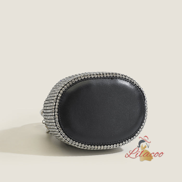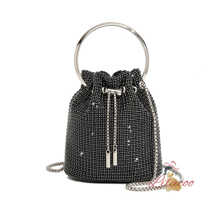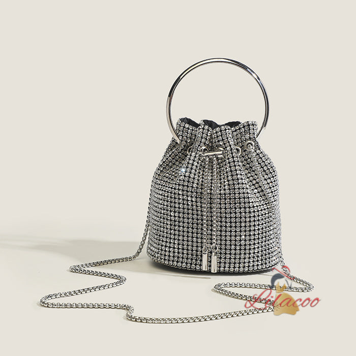 Ornate and practical, this crystal-adorned handbag is the epitome of luxury. The exterior is covered in dazzling crystals, reflecting light from every angle and adding a touch of glamour to any outfit. The bucket-style design is spacious enough to hold all your essentials, making it perfect for both day and night events. The drawstring closure not only keeps your items secure but also adds a sophisticated flair to the overall look. The metal handle is both stylish and functional, providing a comfortable grip. Additionally, the handbag features a detachable chain strap, giving you the option to wear it as a shoulder bag or carry it as a clutch. This handbag is the perfect accessory to elevate your style and make a statement.