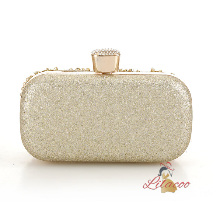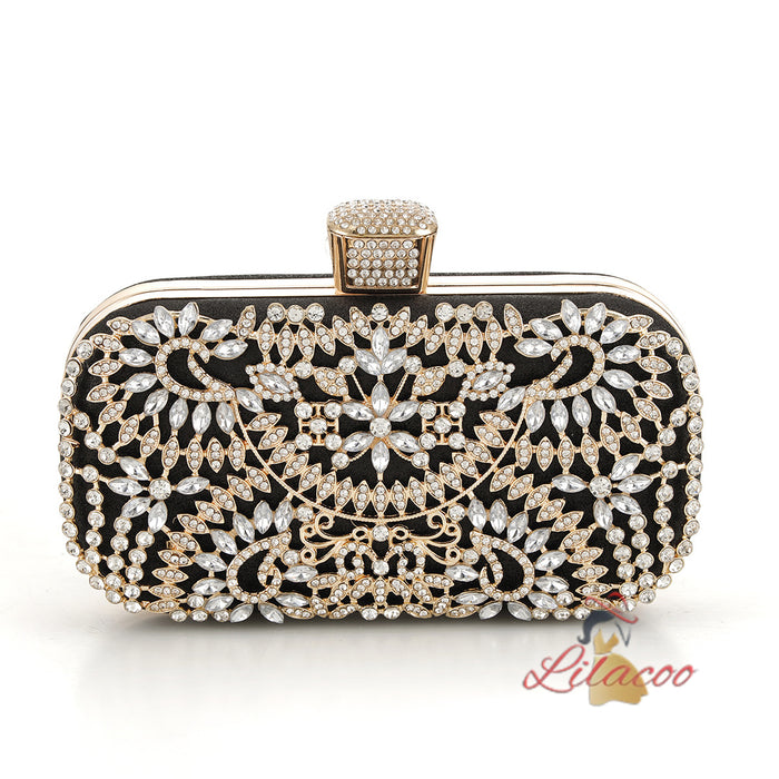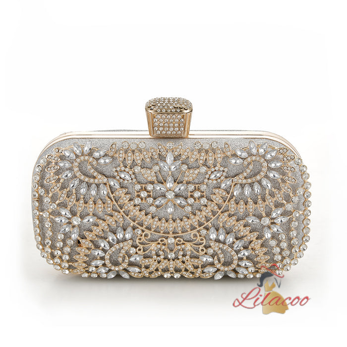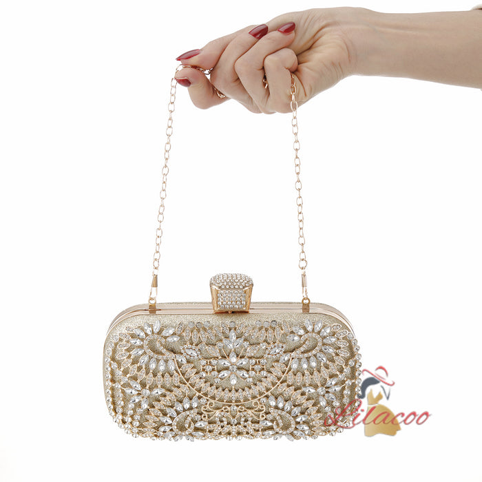 Presenting an exquisite golden clutch that is sure to make you the center of attention at any event. This luxurious handbag boasts an intricate design, adorned with sparkling crystals arranged in a captivating floral and swirl pattern. The clasp is equally stunning, encrusted with tiny crystals that add a touch of elegance and refinement. Perfect for evening galas, weddings, or any special occasion, this clutch is a statement piece that will elevate any outfit. The high-quality materials ensure durability, while the shimmering gold base adds a touch of glamour. Inside, the clutch is lined with soft fabric, providing a safe space for your essentials. The compact size makes it easy to carry, yet spacious enough to hold your phone, keys, and makeup. This clutch is not just an accessory; it's a piece of art that adds a luxurious touch to your ensemble. Make a lasting impression with this dazzling golden clutch, a perfect blend of elegance and sophistication.