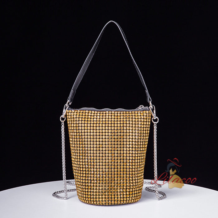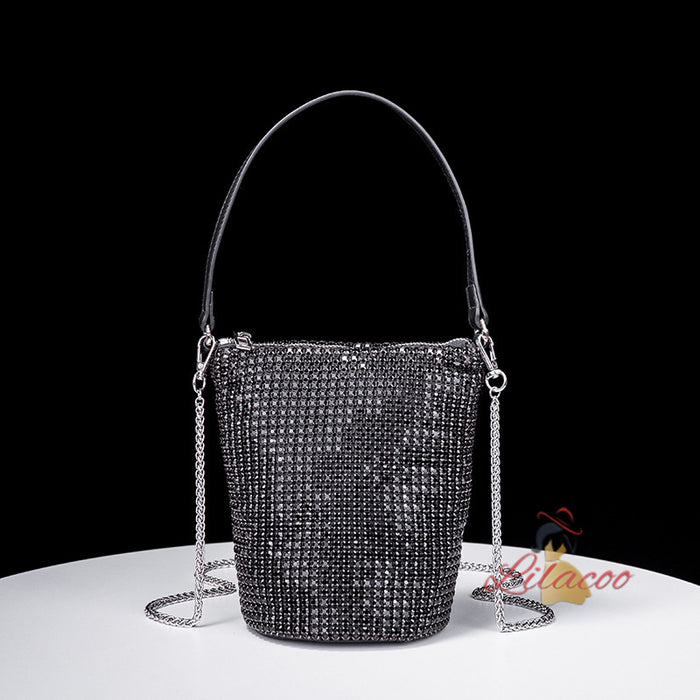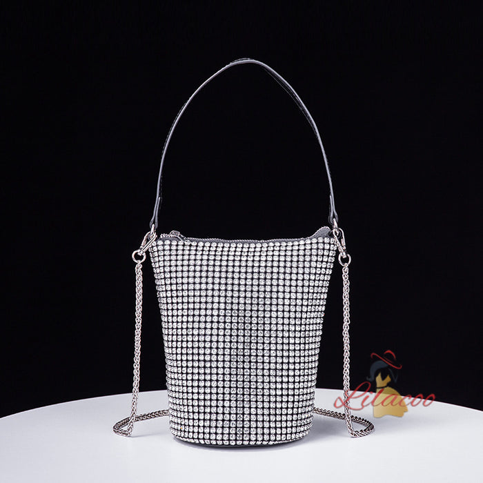 Outshine everyone at your next event with this dazzling handbag, a true embodiment of glamour and sophistication. This exquisite piece features a stunning array of crystals set in a uniform grid pattern, creating a mesmerizing sparkle from every angle. The bag’s cylindrical design is both chic and contemporary, making it a versatile addition to any wardrobe. The detachable chain strap allows for easy conversion from a stylish clutch to a convenient shoulder bag. Inside, the bag is lined with a soft, luxurious fabric that not only protects your belongings but also adds a touch of refinement. Perfect for formal occasions, this handbag will ensure you stand out with grace and elegance.