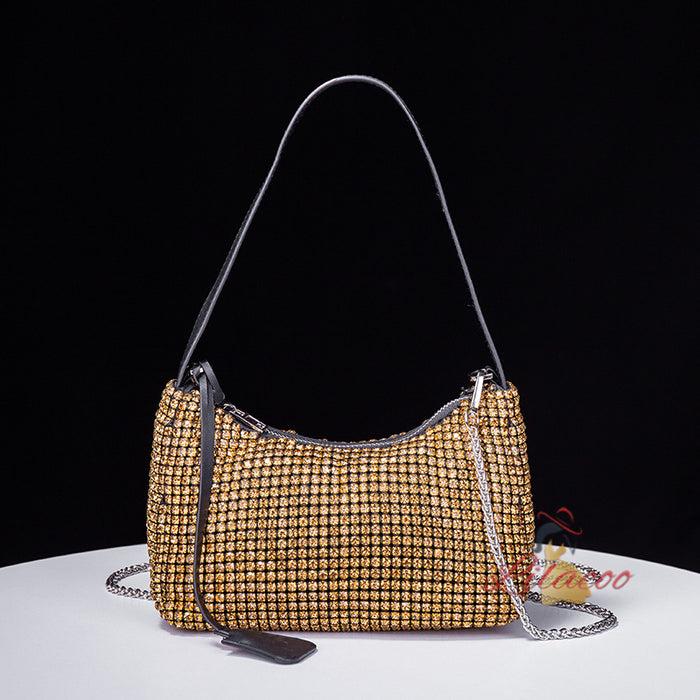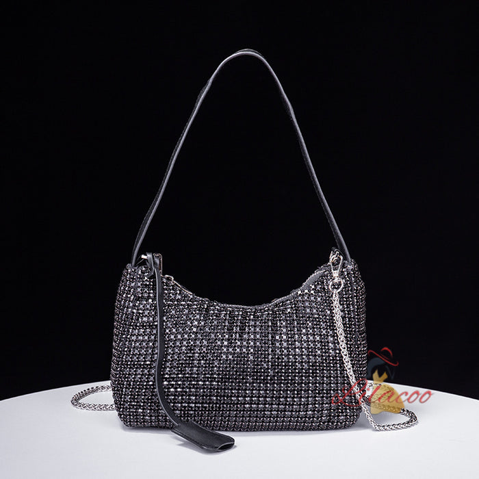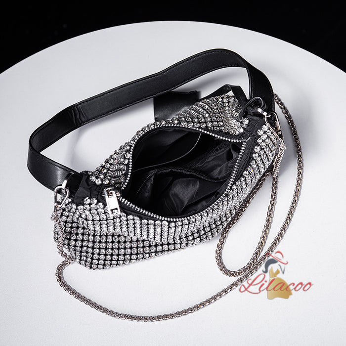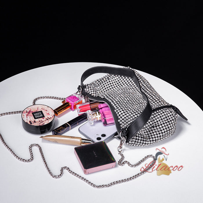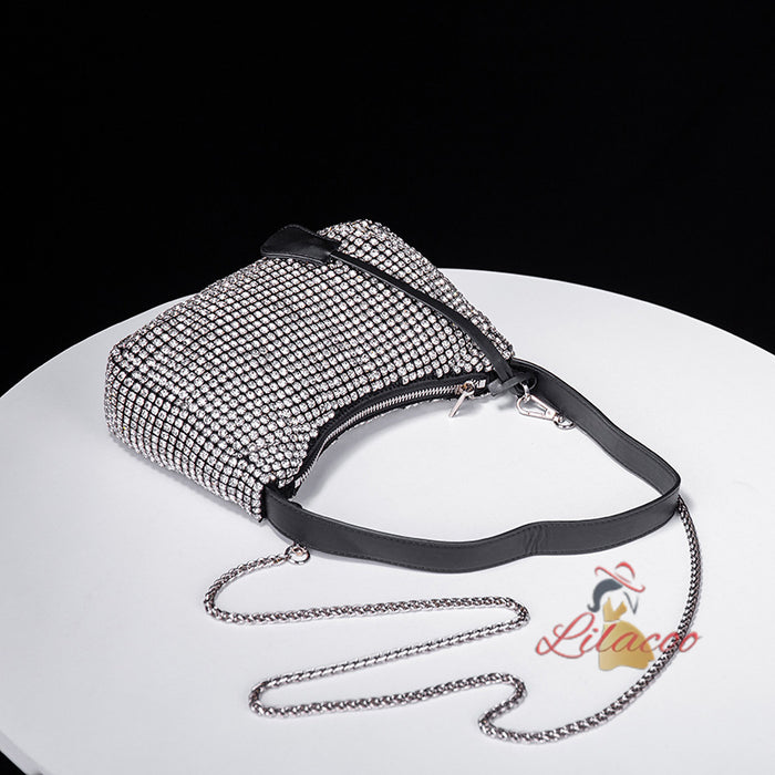 Opulent and effortlessly chic, this handbag is the epitome of sophistication and glamour. The bag is adorned with an array of sparkling crystals that catch the light beautifully, ensuring you turn heads wherever you go. The elegant drawstring closure not only adds a modern touch but also keeps your belongings secure. The detachable chain strap allows for versatile styling options, letting you switch between a crossbody and shoulder bag with ease. Inside, you'll find ample space to carry your essentials, from your phone to your evening makeup. This handbag is perfect for formal events, weddings, or any occasion where you want to make a lasting impression. The exquisite craftsmanship and attention to detail make this bag a standout piece that will elevate any outfit, adding a touch of luxury and sophistication.