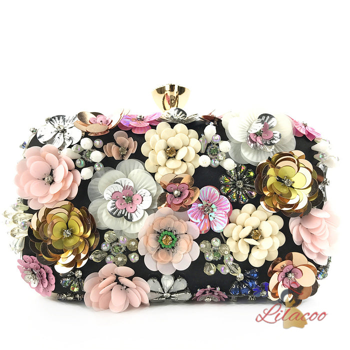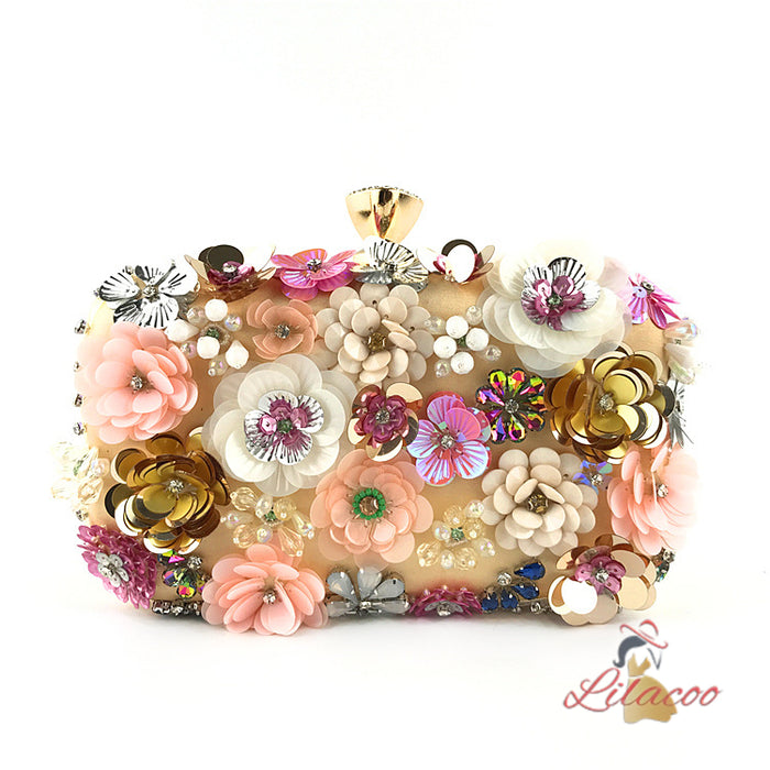 Hugging the fine line between whimsical beauty and refined elegance, this floral handbag is a must-have accessory. The exterior is lavishly decorated with a variety of flowers in soft hues of pink, white, and gold, each embellished with sparkling crystals. The meticulous craftsmanship of the floral design adds depth and texture, creating a captivating and luxurious look. The gold handle and detachable chain strap provide flexibility in how you carry it, whether as a clutch or over your shoulder. The secure clasp closure, featuring a crystal accent, ensures your belongings are kept secure. Inside, the handbag offers ample space for your evening essentials, making it both stylish and functional. Perfect for formal occasions, weddings, and upscale parties, this handbag will elevate your look and ensure you make a lasting impression.