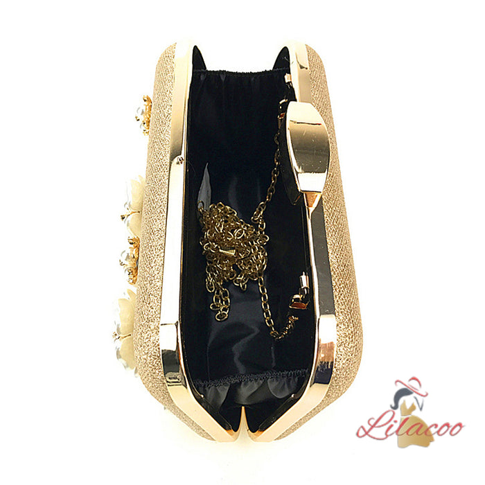 Highlight your evening ensemble with this breathtakingly beautiful handbag, designed to exude elegance and charm. The shimmering gold fabric of the clutch provides a luxurious backdrop for the exquisite 3D floral appliqués. Each flower is meticulously crafted from satin and adorned with lustrous pearls and delicate beadwork, creating a stunning, textured look that catches the light from every angle. This handbag is not just about aesthetics; it offers practical features too, with enough space to hold your essentials securely. The secure clasp closure ensures your items are safe, while the detachable chain strap offers versatility in carrying options. Whether you’re attending a wedding, a gala, or a formal dinner, this handbag will add a touch of sophistication and glamour to your outfit.