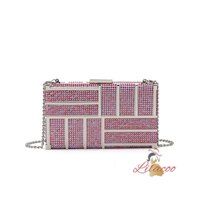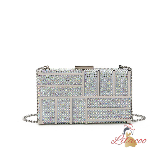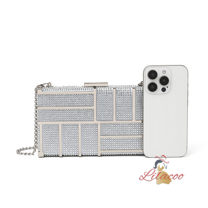 Own the night with this dazzling handbag. The rectangular clutch features a captivating geometric pattern, adorned with sparkling crystals that catch the light beautifully. The sleek, metallic frame adds a touch of modern elegance, making it a versatile accessory for any occasion. Its compact size is perfect for holding your essentials, while the secure clasp closure ensures they stay safe. The detachable chain strap offers versatility, allowing you to wear it as a shoulder bag or carry it as a clutch. Whether you're dressing up for a special event or adding a touch of glam to your everyday look, this handbag is a perfect choice. The impeccable craftsmanship and luxurious details make it a timeless piece that will elevate your style.
