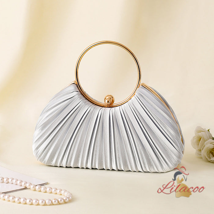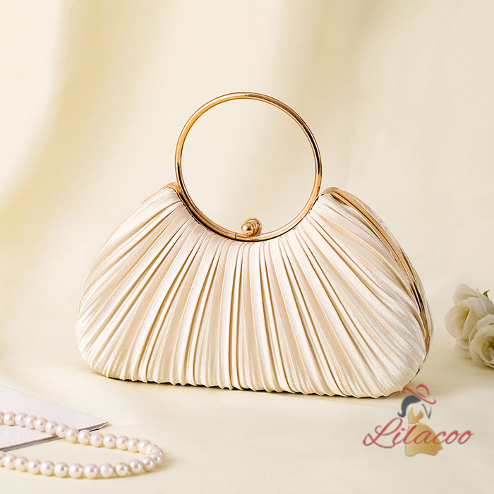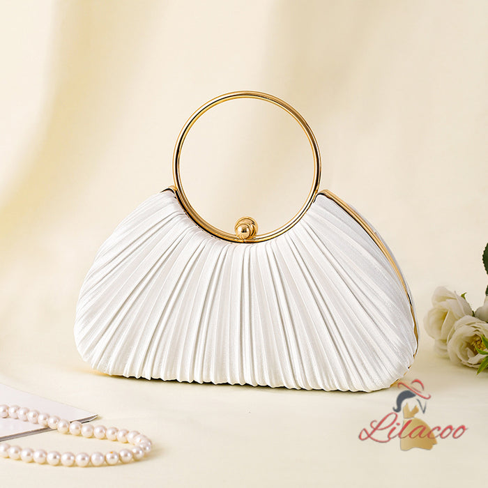 Harmoniously blending classic design with a modern twist, this elegant handbag is a must-have accessory for any fashion-forward individual. The beautiful pleated exterior, made from a soft ivory fabric, exudes sophistication and grace. The unique circular gold handle not only adds a touch of luxury but also provides a comfortable and stylish way to carry the bag. Inside, there is ample space for your evening essentials, making this handbag as functional as it is beautiful. The secure closure ensures your belongings are kept safe, allowing you to enjoy your event worry-free. Perfect for weddings, galas, or any formal occasion, this handbag will add a touch of elegance to your outfit and make you feel truly special.