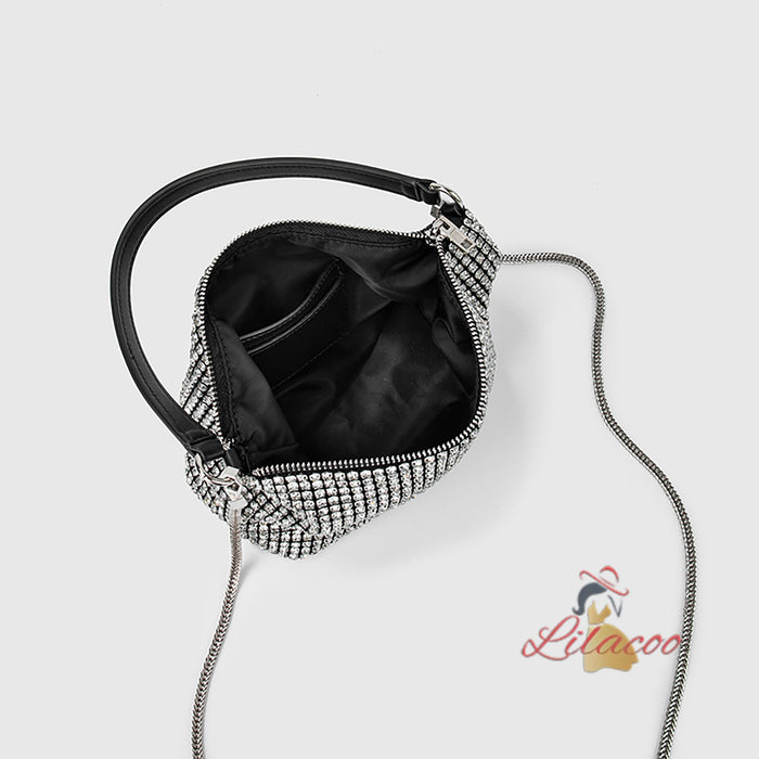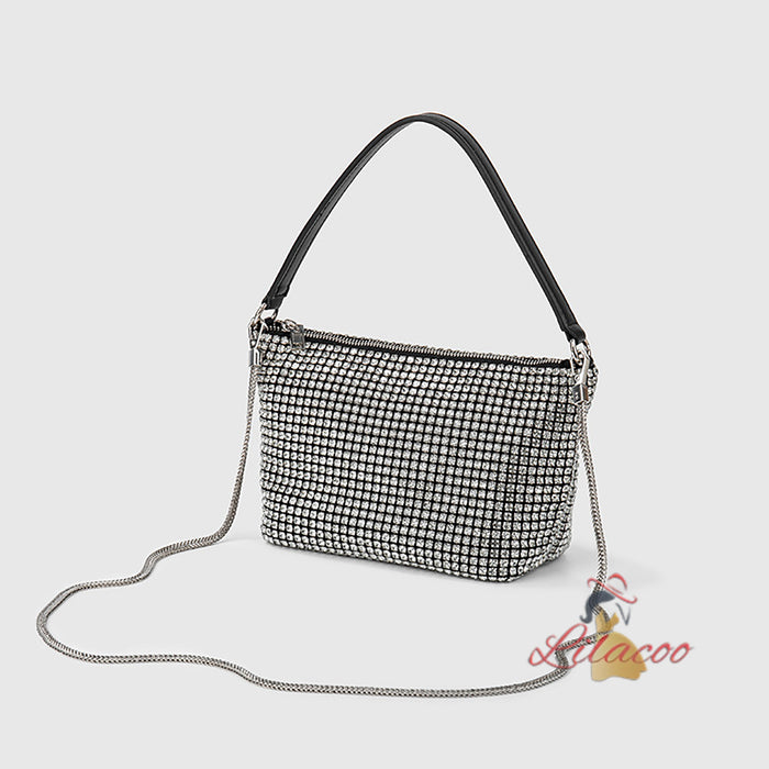 On-trend and luxurious, this handbag is the epitome of sophistication and style. The crystal-covered exterior shimmers beautifully, ensuring you stand out in any crowd. The modern, rectangular shape is not only chic but also highly functional, providing ample space for your belongings. The sturdy leather strap allows for easy carrying, while the detachable chain strap adds versatility to your styling options. With a secure top zipper closure and well-designed interior compartments, this handbag keeps your essentials organized and safe. Ideal for both special occasions and everyday use, this handbag is a versatile accessory that combines practicality with a touch of opulence, making it a valuable addition to any fashion-forward wardrobe.