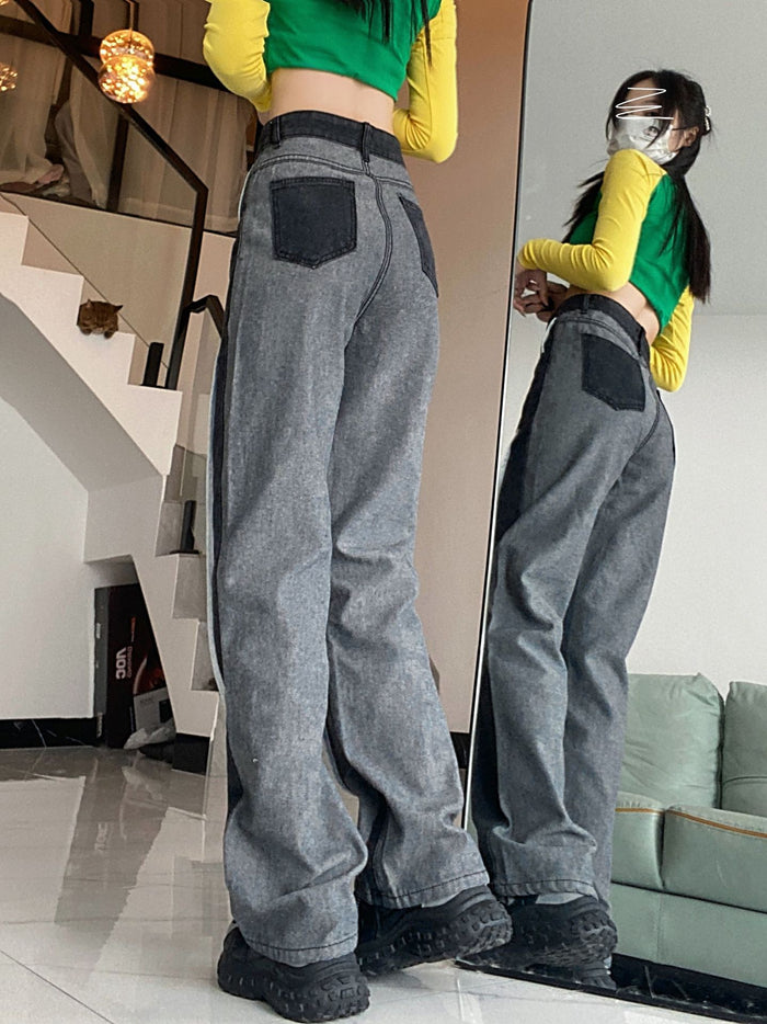 Accentuating a modern twist on classic denim, these jeans feature a striking contrast of textures and tones. The core dark denim is flanked by soft gray panels, outlined by a white stripe that runs the length of the leg, offering a visually elongating effect. The high-waisted design supports a flattering fit, while the wide-leg cut provides a comfortable yet fashion-forward silhouette. These jeans are a perfect fusion of sporty flair and casual cool, making them ideal for those looking to add a dynamic edge to their everyday style.