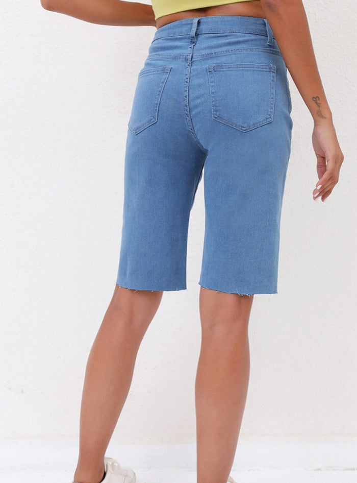 Refresh your collection of denim with these versatile light blue shorts, designed to complement a variety of looks. The knee-length design merges modesty with contemporary fashion, while the frayed edges provide a hint of edginess. Whether dressed up with wedges and a blouse for an afternoon outing, or down with flats and a relaxed tee for comfort, these shorts are a reliable staple for any style-conscious wardrobe.