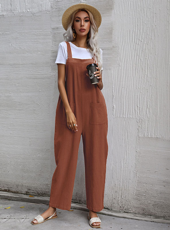 This stylish jumpsuit is a must-have for any fashion-forward wardrobe. Crafted from a comfortable blend of cotton and linen, it's perfect for a variety of occasions, from casual outings to work and date nights. The sleeveless design is both versatile and on-trend, making it easy to dress up or down with different tops and accessories. The adjustable waistband and straps ensure a perfect fit, while the large pockets add a touch of functionality to this stylish piece. Whether you're looking for a summery look or a layering option, this jumpsuit is sure to become a staple in your wardrobe.