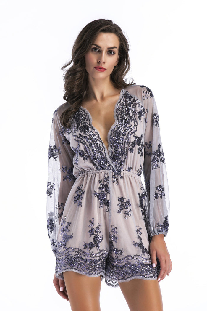 The sheer mesh overlay mini romper is a stunning piece ideal for a night out on the town. The nude lining provides coverage while the sheer mesh overlay adds texture and dimension. The sequin embellishments are intricately placed in a floral and ornate pattern, making for a glamorous and eye-catching design. The plunging surplice neckline and scalloped hem add a touch of elegance, while the elasticized waist ensures a comfortable and flattering fit. The long sheer sleeves with elasticized cuffs add a touch of whimsy to this already playful romper. The invisible back zipper completes the look, making it easy to slip on and off.