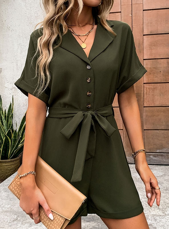 Mixing contemporary design with classic elegance, this olive green jumpsuit is a standout piece for any wardrobe. The tailored fit and button-down front provide a sleek and polished look, while the tied waist adds definition to your silhouette. The short sleeves and relaxed shorts make it perfect for warm weather, ensuring you stay cool and comfortable. Crafted from high-quality fabric, this jumpsuit offers durability and style in one. Pair it with flat sandals for a casual day look or with wedges and a statement necklace for a night out. The versatility and timeless design make this jumpsuit a reliable choice for any occasion. Elevate your everyday fashion with this chic and effortlessly stylish jumpsuit that brings both comfort and sophistication to your wardrobe.