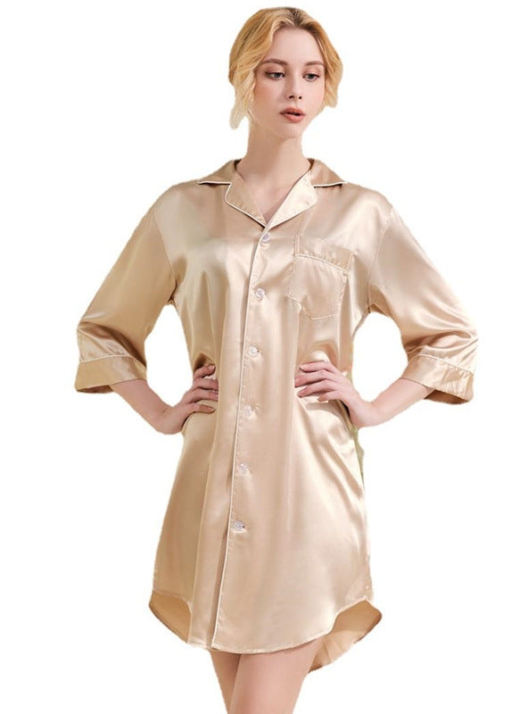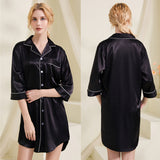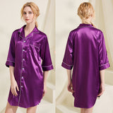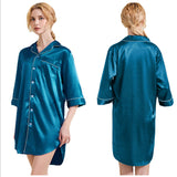 Finally, indulge in the ultimate sleepwear luxury with this exquisite satin nightgown. The rich, deep blue hue paired with delicate white piping exudes elegance and sophistication, making you feel both beautiful and comfortable. The silky smooth fabric glides over your skin, providing a sensuous touch that enhances your sleep experience. Designed with a relaxed fit, this nightgown offers ample space for movement, ensuring you can sleep and lounge in absolute comfort. The convenient button-down front makes it easy to slip into, while the three-quarter length sleeves offer just the right amount of warmth without being too restrictive. The practical chest pocket adds a charming detail, perfect for small essentials. This nightgown is not just about comfort; it’s about experiencing a touch of luxury every night. Elevate your sleepwear collection with this stunning piece and enjoy a nightly escape into comfort and style.
