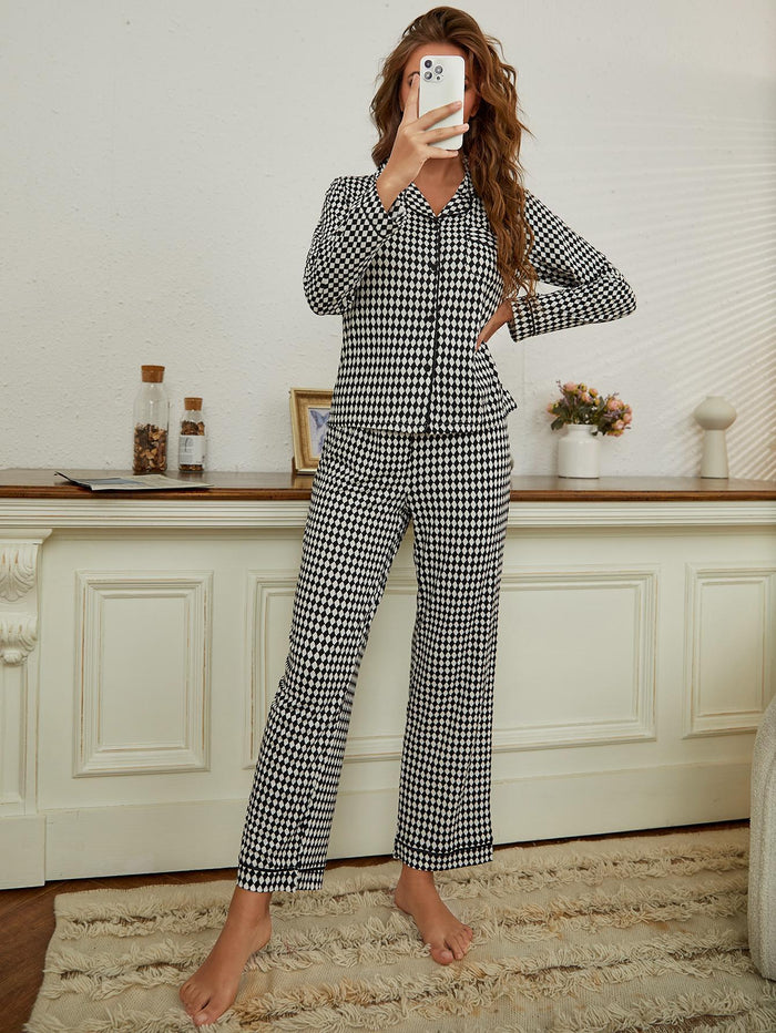 Keep it cool and charismatic at bedtime with this checkered pajama suit! The stylish top flaunts a button-down front, crisp collar, and cuffed sleeves, while the matching pants are tailored with a comfortable elastic and drawstring waist, ensuring a perfect fit. This pajama set's bold pattern and relaxed cut are perfect for those who love to combine a dapper look with the ease of loungewear. Whether it's for a restful night's sleep or a day of relaxation at home, this pajama suit is your ticket to timeless style and unmatched comfort.