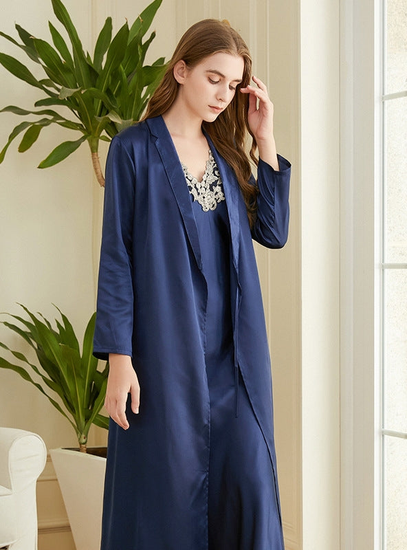 Capture the essence of elegance with our luxurious red satin sleepwear set, designed to elevate your nighttime wardrobe. This exquisite set features a long, flowing robe and a matching nightgown, both crafted from high-quality satin that feels incredibly smooth against your skin. The robe is designed with long sleeves and a relaxed fit, providing both comfort and style. It drapes beautifully, adding a touch of sophistication to your loungewear collection. The matching nightgown is adorned with delicate lace detailing at the neckline, enhancing its feminine charm. The lightweight and breathable fabric ensures you stay cool and comfortable, making this set perfect for year-round wear. Whether you're lounging at home or preparing for a restful night's sleep, this satin sleepwear set promises to keep you looking and feeling your best. Treat yourself to the ultimate in comfort and elegance with this stunning red satin sleepwear set.