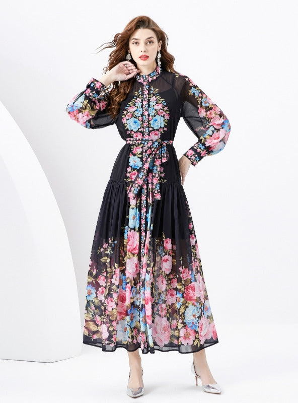 Orchid Elegance: Enter the room with the ethereal grace of the Orchid Elegance dress. This exquisite piece is a symphony of florals set against a midnight canvas, evoking the mysterious beauty of a garden at twilight. With a high neckline and full-length sleeves, it offers a silhouette that is both modest and commanding. The bodice, cinched at the waist, blooms into a flowing skirt that whispers stories of romance with every movement. This dress is a perfect ensemble for an evening of sophisticated tastes or a high-profile event where making a memorable impression is key. Let this garment be your statement—a blend of boldness and classic beauty.