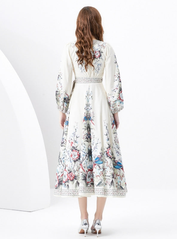 Opulent Blossom: Revel in the majesty of the Opulent Blossom dress, a creation that captures the splendor of a renaissance garden at the peak of spring. With its deep V-neckline and graceful bell sleeves, this dress is a canvas of ivory elegance, adorned with rich floral prints that speak to a bygone era of regal opulence. The meticulously placed patterns along the bodice draw in the eye, celebrating the female form with a tastefully cinched waist. This dress cascades into a full skirt, bordered with intricate patterns that echo the elaborate wrought iron gates of ancient villas. For a gala event or an upscale evening affair, this dress is a testament to timeless beauty and sophistication.
