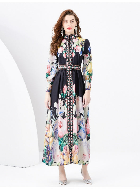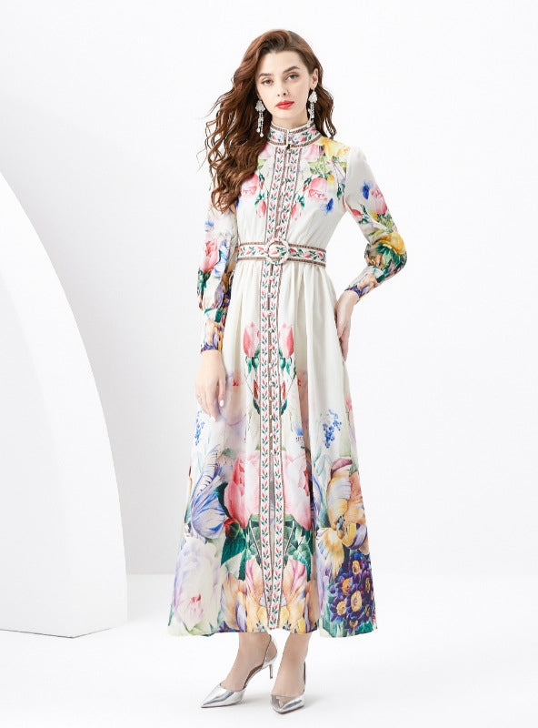 Orchestrating a symphony of floral elegance, this dress is a wondrous blend of colorful blooms set against a soft ivory backdrop. Its long sleeves and high neck collar exude a regal charm, accentuated by a rich tapestry of botanical motifs in vibrant hues that seem to tell tales of hidden gardens in full bloom. The slim waist is defined by a delicate, patterned belt that leads to a gently pleated skirt, allowing the fabric to cascade gracefully to mid-calf length. Ethereal and sophisticated, this dress embodies the joy of spring and the sophistication of a well-crafted garden. It is a perfect choice for daytime events where you want to be the embodiment of nature's beauty or for evenings where elegance is key.