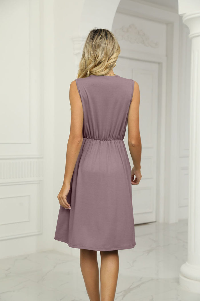 Solid Color V-neck Stitching Sleeveless Pocket Dress