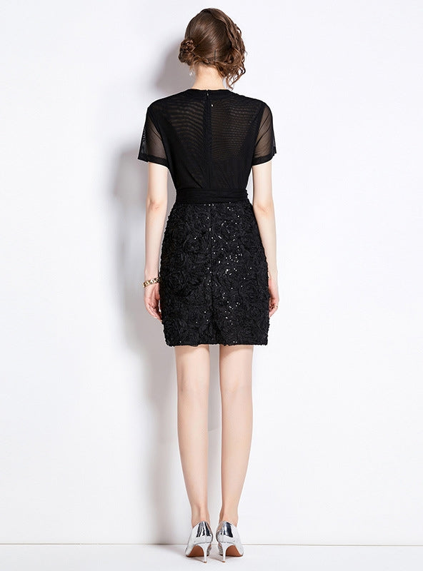 Host of charm, this black dress offers an enchanting silhouette that combines timeless elegance with contemporary fashion. The body of the dress is crafted from luxurious embroidered fabric that boasts detailed patterns, each stitched with precision to catch the eye. Sheer panels at the shoulders and neckline inject a modern, sensual appeal, balancing the detailed intricacy of the embroidery. This dress is tailored to accentuate the waist with a sleek, self-tie belt, ensuring a flattering fit that celebrates the female form. Ideal for upscale events, it's a piece that speaks of sophistication and refined taste.
