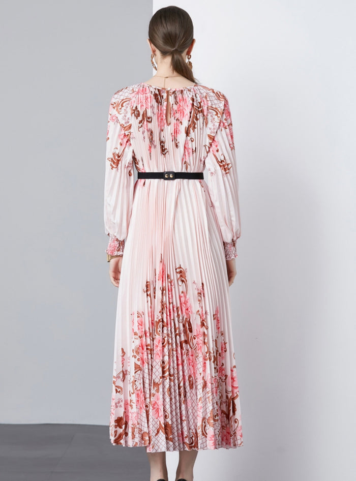 Masterfully designed, this enchanting dress is a vision of romantic elegance and modern craftsmanship. The garment's pleated chiffon fabric floats around the body in airy waves, exuding grace with every step. Adorned with a delicate print that depicts a whimsical fusion of floral and baroque motifs, the dress offers a narrative of luxury and fantasy. Its blush pink palette is beautifully interrupted by strokes of rosewood and earthy tones, creating a print that catches the eye without overwhelming the senses. The full sleeves and gathered neckline add a touch of regal sophistication, while the cinched waist is highlighted by a contrasting belt, offering a silhouette that is both flattering and timeless. Ideal for a gala or a sophisticated evening event, this dress is sure to leave a lasting impression.