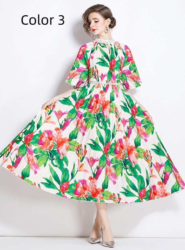 Opaline hues serve as the perfect backdrop for the vibrant floral patterns that adorn this mid-length dress. The pleated fabric captures and reflects light, giving the dress a luminescent quality that is both eye-catching and flattering. The design features a high collar and short sleeves, adding a conservative yet stylish touch to the overall aesthetic. This dress is ideal for those who appreciate the subtle interplay of color and texture and are looking for a standout piece for daytime events or casual evenings out.
