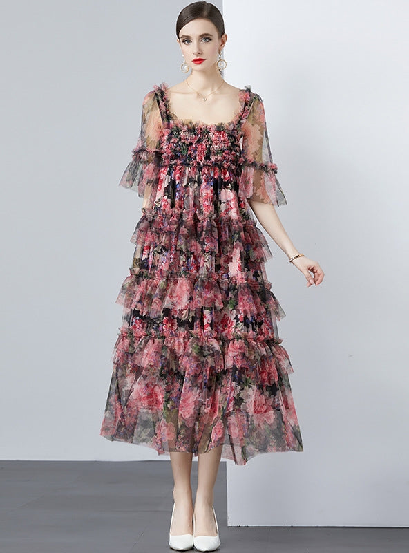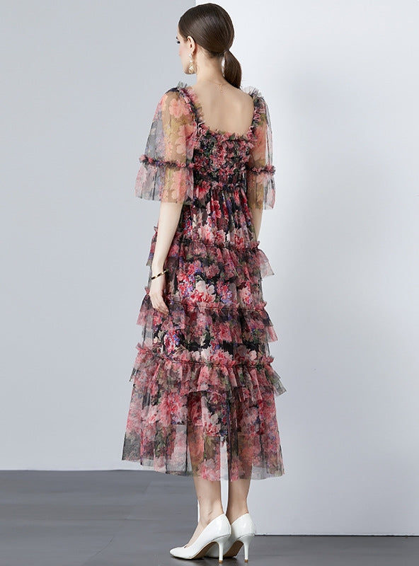 Happily layered, this dress combines texture, color, and design to create a stunning visual effect that is both sophisticated and playful. The multi-tiered skirt, adorned with a floral print that seems to dance across each layer, exudes a lively yet refined look. The soft, sheer fabric used throughout the dress ensures it remains light and breathable, while the detailed floral embroidery enhances its luxurious feel. Perfect for upscale events or stylish social gatherings, this dress appeals to those with a love for intricate designs and flowing silhouettes. It pairs beautifully with simple accessories to let the intricate patterns and layers take center stage.