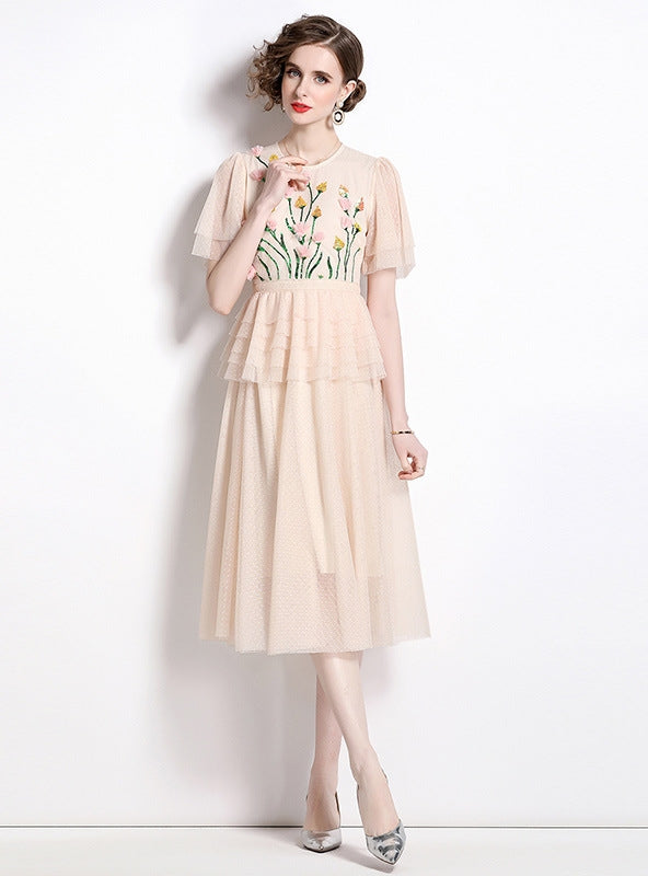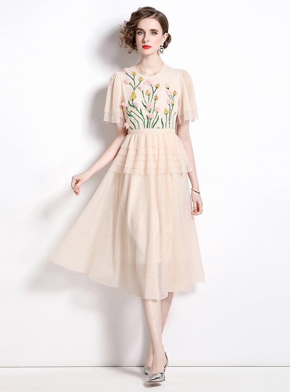 Surreptitiously charming, this beige embroidered dress showcases a quiet allure with its detailed craftsmanship. The fabric features a subtle texture that complements the intricate floral embroidery on the chest, adding depth and interest to the overall design. The layered skirt tier enhances the garment's playful yet elegant appearance, perfect for those looking to add a sophisticated yet fun piece to their wardrobe. This dress is cut to flatter, with a well-defined waist and a flared skirt that suits all body shapes. Ideal for afternoon teas, garden parties, or any event where a touch of whimsy is welcomed.