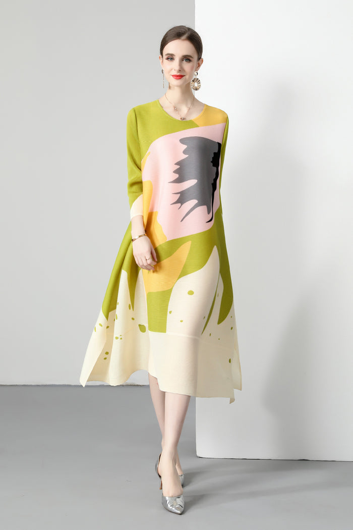 Motif-laden and striking, this dress is a parade of vivacity with its dynamic patterns and bold colors. The cream base serves as the sky for a flock of playful red birds, while the hem is a landscape of undulating hills in shades of blue and sunset orange. Crafted with long sleeves and a comfortable round neckline, the dress is both practical and effortlessly stylish. Its flowing A-line skirt creates a sense of movement, mirroring the lively print. With a subtle nod to the abstract art of the mid-century, this dress encapsulates a spirit of whimsy and artful expression. It is a perfect choice for those who wish to make a statement without saying a word, offering an excellent canvas for accessorizing with minimalist jewelry and sleek footwear.