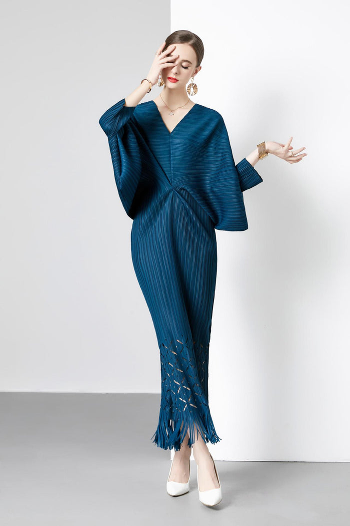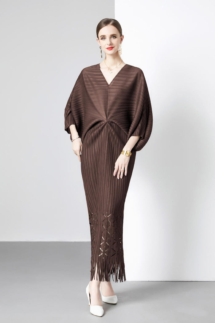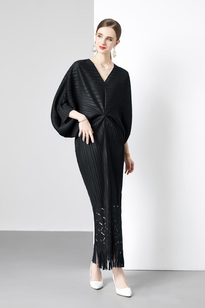 2024 Loose Bat Sleeve V-neck Fringed Pleated Dress