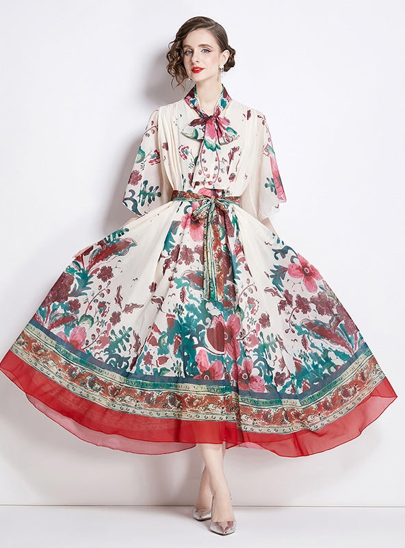Horizon of flora reflects the vast and varied patterns displayed on this exquisite dress. It's a piece that speaks of artistry and attention to detail with its intricate floral prints and color-blocking at the hem, creating a visual feast. The lightweight fabric drapes beautifully, offering an ethereal feel that’s both luxurious and approachable. This dress is perfect for those who appreciate garments that combine functionality with high fashion, offering a belt to cinch the waist for a custom fit. It's an excellent choice for outdoor events, where its colors and design can truly stand out.