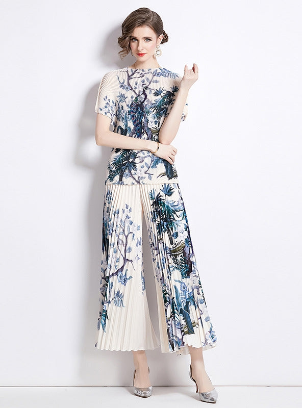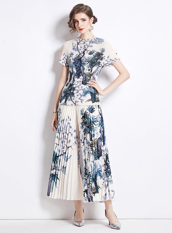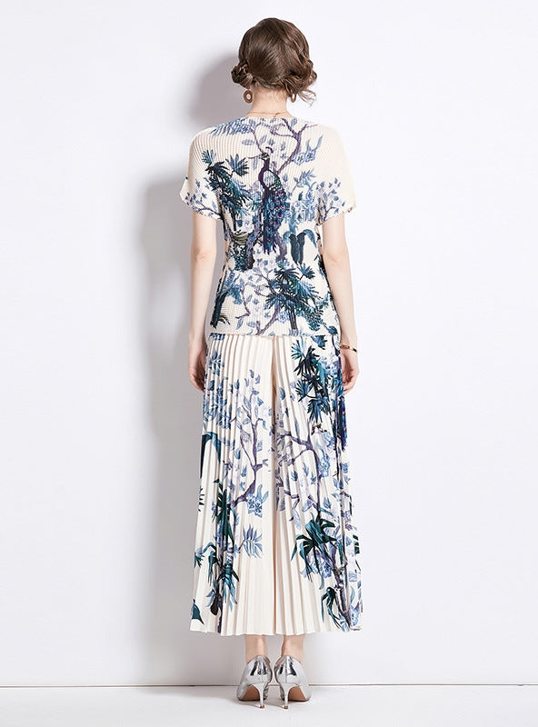 Evoke a sense of serene sophistication with this strikingly patterned midi dress, a masterpiece of design blending classic elegance with a modern print. The bodice starts with a delicate, cream-colored base, upon which a myriad of blues unfurl in a botanical print, evoking images of a crisp, early morning in a blooming garden. The dress cinches at the waist with a slender belt, before flowing into a pleated skirt that dances just above the ankles, offering glimpses of grace with every step. The round neckline and short sleeves keep the silhouette simple yet refined, allowing the pattern to speak volumes. Ideal for high-tea affairs or strolling through art galleries, this dress promises a stylish statement with an air of effortless charm.