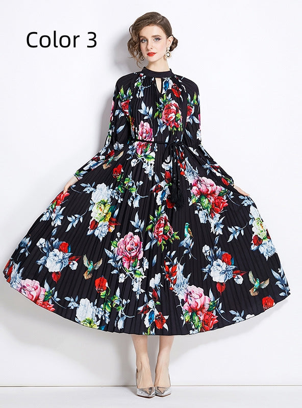 Omnipresent charm exudes from this floral printed dress, designed to capture the essence of floral beauty in every thread. The garment features a high neckline and long sleeves, which balance coverage with style, making it a great choice for various settings from professional to social. The white fabric serves as a canvas to the vibrant floral motifs in red, blue, and green, ensuring it stands out in any wardrobe. A pleated skirt enhances the body's natural lines while providing ample movement. This dress is particularly appealing for those who appreciate garments that combine functionality with high fashion sensibility.