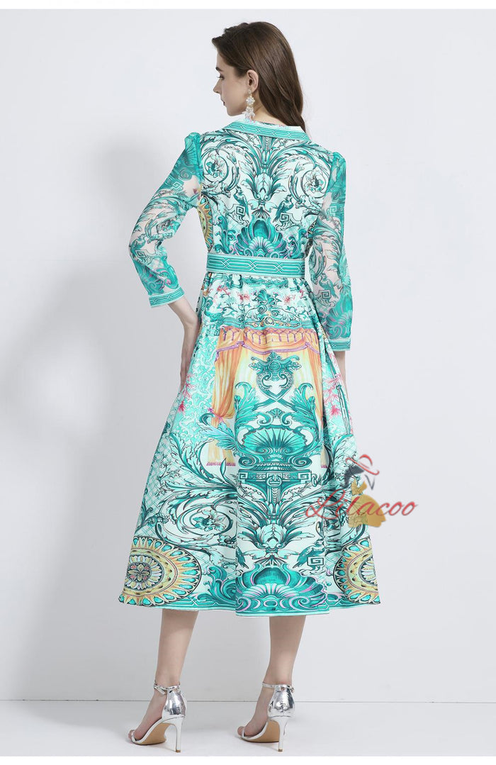 Single out this Aqua Baroque Maxi Dress for a truly distinctive and luxurious choice. Its bright aqua hue is paired with intricate baroque-style patterns, creating a design that is both artistic and regal. The collared neckline and buttoned bodice provide a tailored, polished look, while the waist-cinching belt ensures a flattering silhouette. The semi-sheer sleeves and flowing skirt add softness and elegance to this bold piece. Whether you’re attending a gala, a garden party, or a cultural celebration, this dress is a head-turner. Its lightweight and breathable fabric guarantees comfort even during long events. Pair it with gold or pearl accessories for a touch of classic sophistication. This dress is a must-have for those who want to make a grand entrance and leave a lasting impression.
