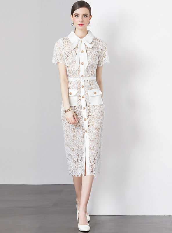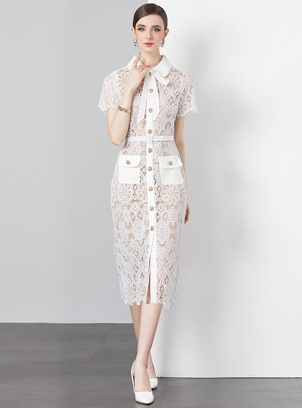 Sublime elegance encapsulates the essence of this stunning white lace dress, a must-have for any fashion-forward wardrobe. This dress features a charming collar with a bow detail that adds a feminine touch, while the entire silhouette is defined by crisp lines and a form-fitting structure that flatters the figure. The lace fabric, adorned with an elaborate floral pattern, offers both beauty and breathability, making it ideal for warmer seasons or indoor events. Each detail, from the faux pockets with button accents to the mid-calf length, is thoughtfully designed to enhance the dress’s functionality without sacrificing style. Gold buttons run down the front, providing a striking contrast to the soft lace, creating a look that is both timeless and contemporary. Whether it’s a corporate event or a social soiree, this dress guarantees a magnetic presence.