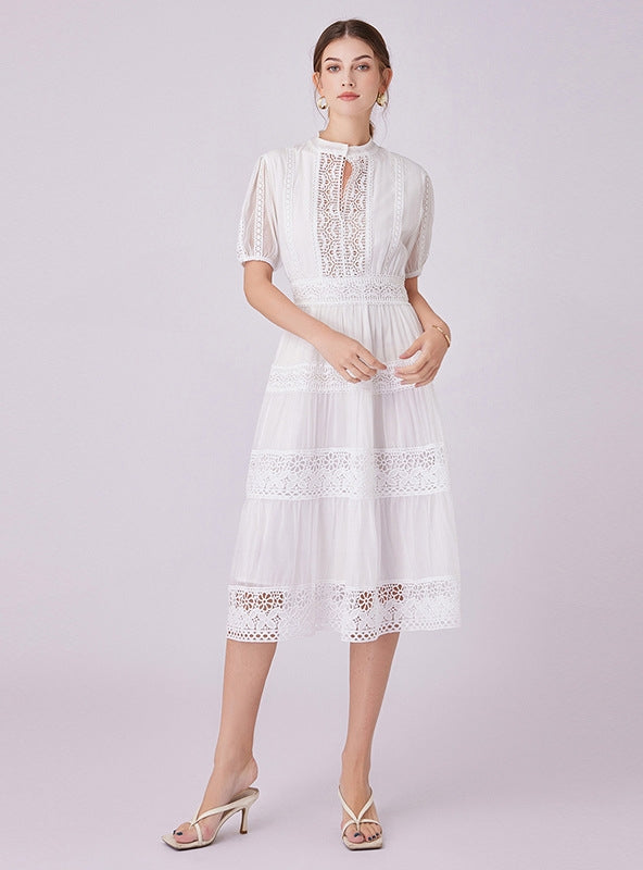 Silent waves of grace exude from this ethereal white lace dress. With its sleeveless design and intricate lace detailing, it perfectly blends elegance with charm. The high-waist belt cinches the silhouette, adding a flattering touch. Layers of soft, flowy fabric create gentle movement, making it ideal for outdoor occasions or garden parties. The semi-transparent lace panels provide a hint of allure without compromising modesty. Pair this dress with nude or white heels, and you're ready to capture the spotlight. Versatile yet unique, it transitions seamlessly from daytime events to evening gatherings, promising unmatched poise in every moment.