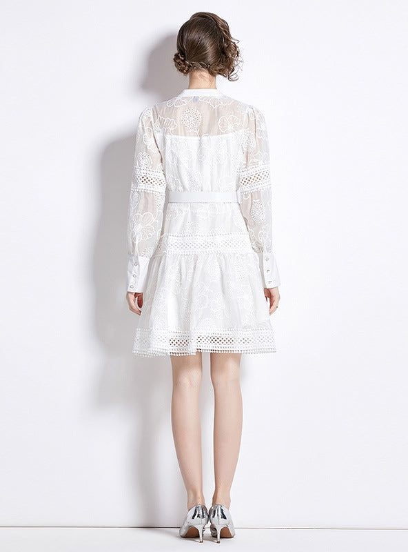 Gossamer threads and ethereal lace converge to create this vision in white, a dress that whispers tales of vintage romance with a modern twist. The delicate overlay of lace is meticulously patterned with florals and geometrics, speaking to the craftsmanship invested in its design. A neat, mandarin collar gives way to a button-down front, drawing the eye to the gentle cinch of the waist, where a sleek white belt with a circular clasp accentuates the silhouette. The dress flares gently, with each tier of the skirt dancing its own subtle rhythm, culminating in a flirtatious hemline that grazes the knee. Full sleeves balloon slightly before tapering to buttoned cuffs, each detail contributing to a symphony of style. Poised yet playful, this dress is a celebration of femininity, ready to grace sun-dappled garden parties or chic urban gatherings.