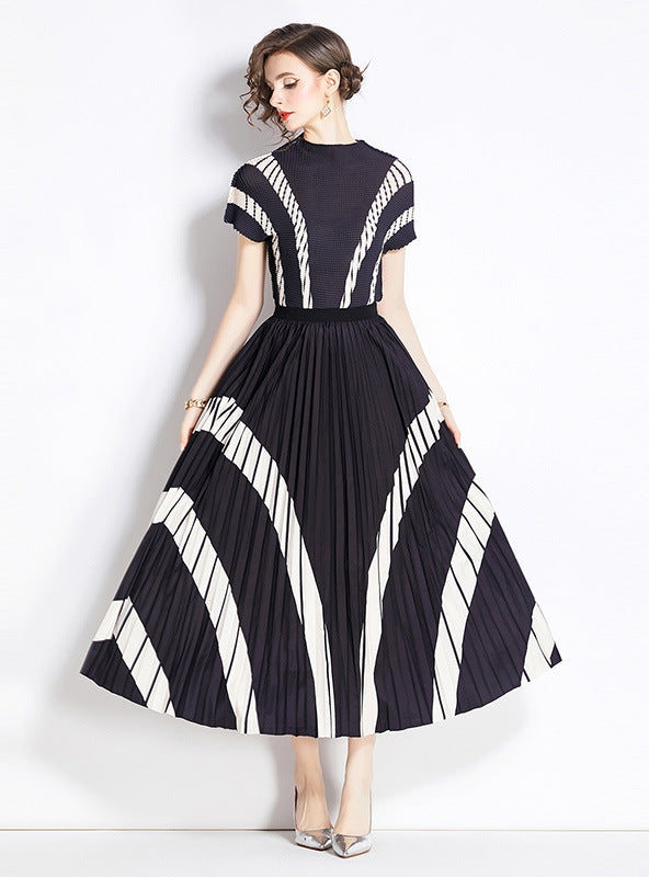 Overture of style and sophistication, this black and white pleated dress is a clear depiction of classic elegance with a modern twist. The striking pattern, reminiscent of piano keys, plays a beautiful melody of lines and curves that flatter the waist and enhance the natural body shape. The high-quality fabric ensures that the pleats remain crisp and the colors do not fade, making it a durable addition to any wardrobe. This dress is particularly suitable for artistic performances, formal gatherings, or any occasion where making a memorable impression is desired.