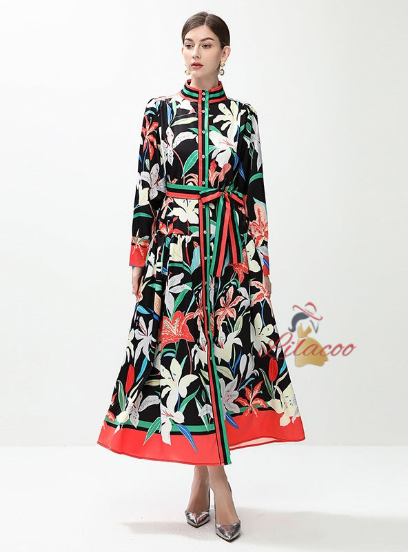Retro Printed Breasted Long Sleeve Dress