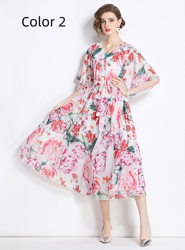 Alluringly exotic, this floral maxi dress encapsulates tropical elegance with its vibrant array of floral prints set against a dark backdrop. The design is perfect for those who appreciate bold, statement pieces that don't compromise on comfort. The fabric is soft and lightweight, ideal for warmer climates or seasonal transitions. With a wrap design that ties at the waist, this dress offers an adjustable fit that can be tailored to flatter any body type. The V-neckline and wide sleeves enhance its relaxed yet refined look, making it versatile for both daytime explorations and evening festivities. Whether attending a beach wedding or a sunset dinner, this dress promises to keep you looking chic and feeling comfortable.
