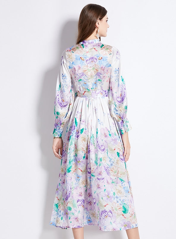 Retro Stand-up Collar Lantern Sleeve Printed Dress