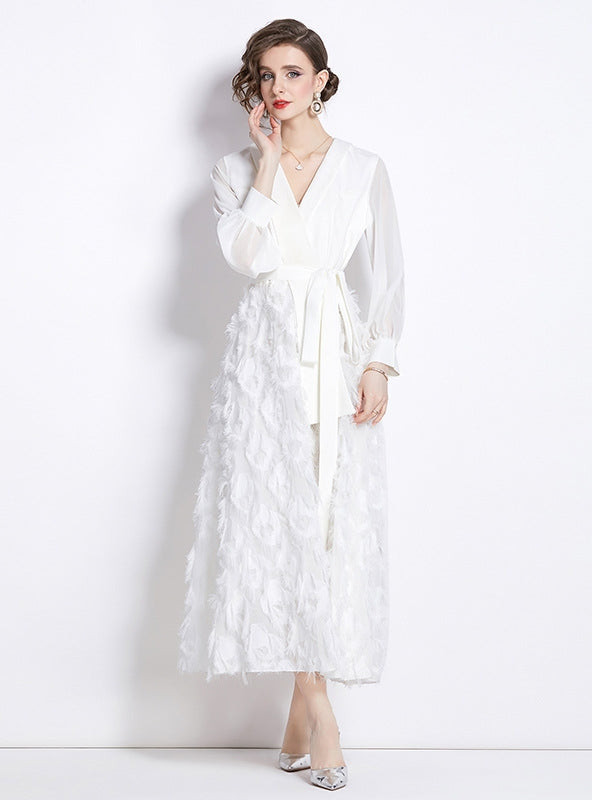 Sumptuously crafted, this white dress is a testament to timeless beauty and modern tailoring. The body of the dress features a textured fabric that creates a rich, layered look, while the top is designed with elegance in mind, featuring a deep V-neckline that adds a touch of allure. The long, flowing sleeves are cinched at the wrists, creating a balloon effect that is both stylish and functional, providing ease of movement. The included belt enhances the waistline, offering a flattering fit that adjusts to the wearer’s shape. This dress is perfect for those who value both aesthetics and comfort, providing a breathable fit that doesn’t sacrifice style. Whether attending a formal function or a casual gathering, this dress ensures you will look poised and polished.