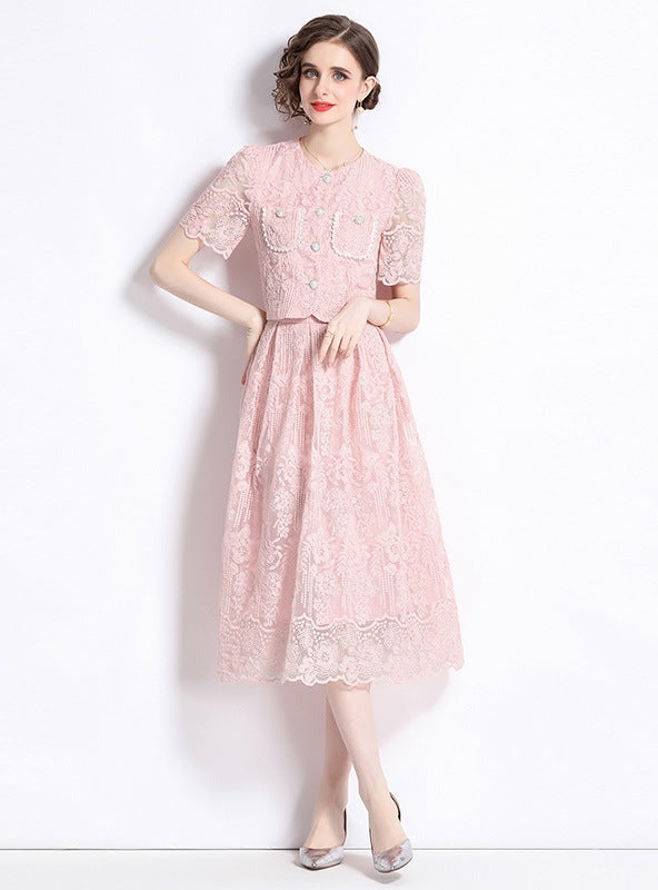 2024 Short Sleeve Lace Shirt+Skirt Two-piece Suit