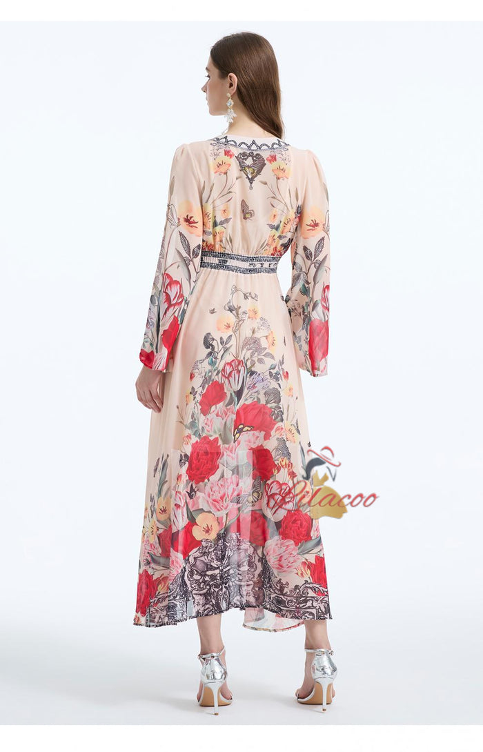 Secure your place in the spotlight with the Beige and Red Floral Chiffon Maxi Dress, a perfect choice for those who love a bold yet delicate design. The dress showcases a beige base with vibrant red floral patterns and subtle green accents, creating a striking contrast. The deep V-neckline and embroidered details along the bodice add an intricate charm, while the long, flowy chiffon sleeves bring elegance and comfort. With a cinched waist and a flowing skirt, it enhances your figure and creates a romantic silhouette. This dress is ideal for outdoor weddings, garden parties, or evening gatherings. Pair it with statement earrings and nude heels for a polished look. The lightweight chiffon fabric ensures breathability and ease of movement, making it both stylish and practical for various occasions.