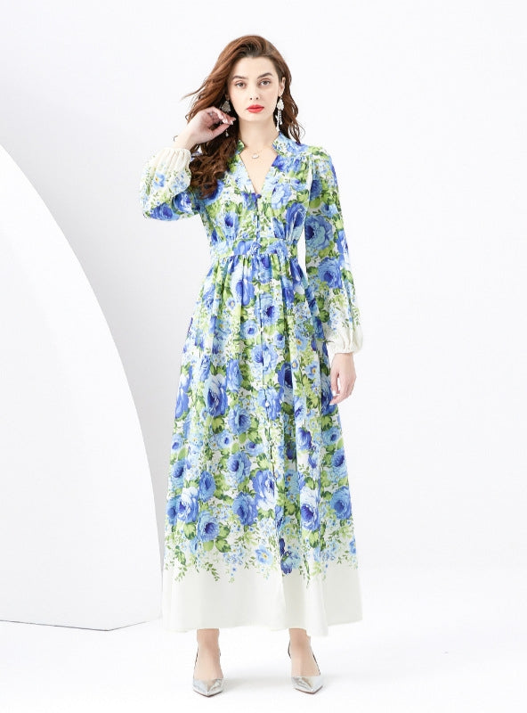 V-neck Lantern Sleeve Wavy Long Retro Print Dress