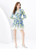 V-neck Lantern Sleeve Wavy Mini Retro Print Dress