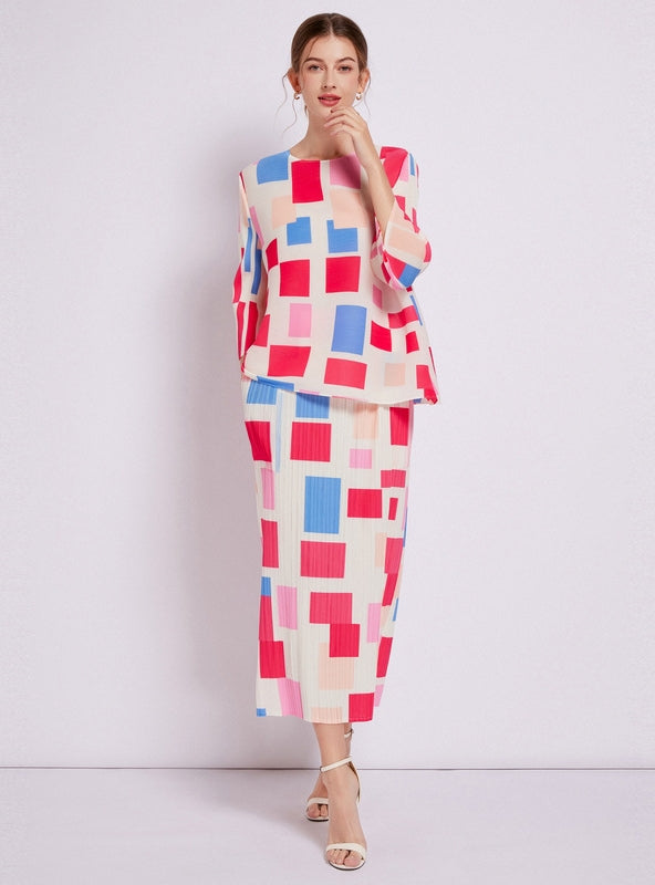 Chromatic Canvas: Ignite your wardrobe with a dress that's a walking masterpiece. The vibrant geometry of blues, reds, and pinks creates a bold statement, akin to modern art. The loose-fitting top cascades gently over the body, providing a canvas of comfort without sacrificing style. The full-length pants maintain a sleek silhouette, tapering towards the ankle for an elegant yet comfortable feel. Ideal for an art gallery opening or a chic work event, this ensemble combines fashion-forward design with wearable artistry. Its unique pattern ensures you stand out in any crowd, while the soft, breathable fabric ensures all-day ease. It's a look that says confidence and creativity, perfect for the woman who is both.