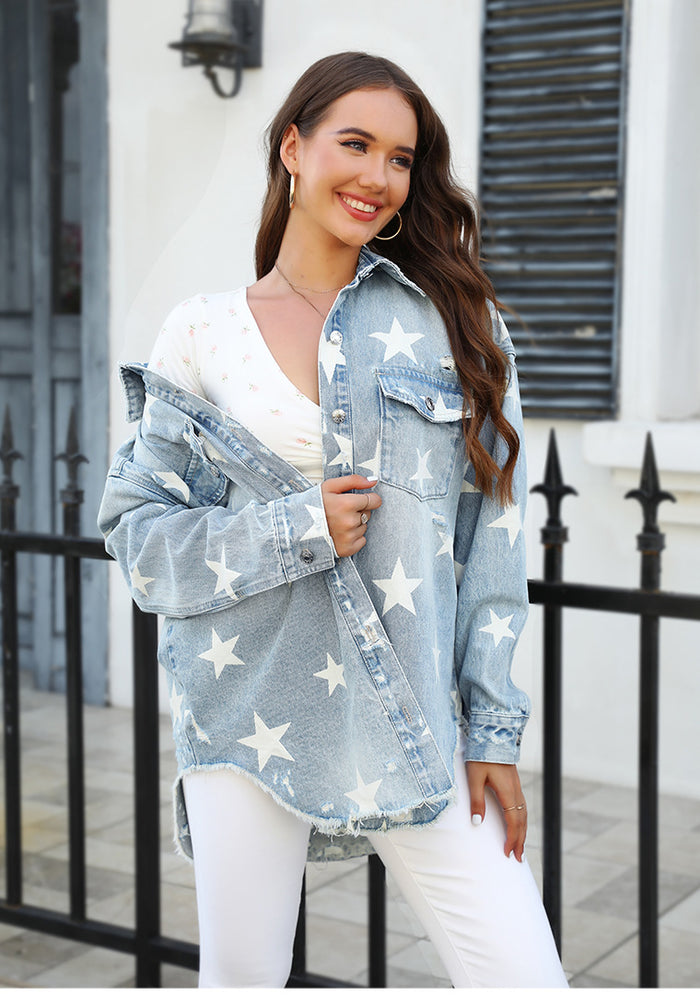 Refresh your look with this sky-blue denim jacket, adorned with whimsical white stars for a playful twist on a classic design. The relaxed fit and distressed details offer a nod to vintage vibes, while the button-up front and structured collar keep it rooted in the essentials of denim wear. Perfect for draping over a summer dress or pairing with crisp white jeans, this jacket is a fun addition to any fashion-forward wardrobe.